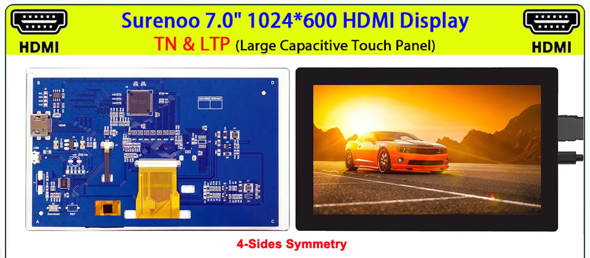 Surenoo HDMI Display 7.0" inch 1024*600 TN LCD Display Module Screen Monitor with USB Large Capacitive Touch Panel CTP LTP for Windows Win11 RaspBerry Pi 4B/5