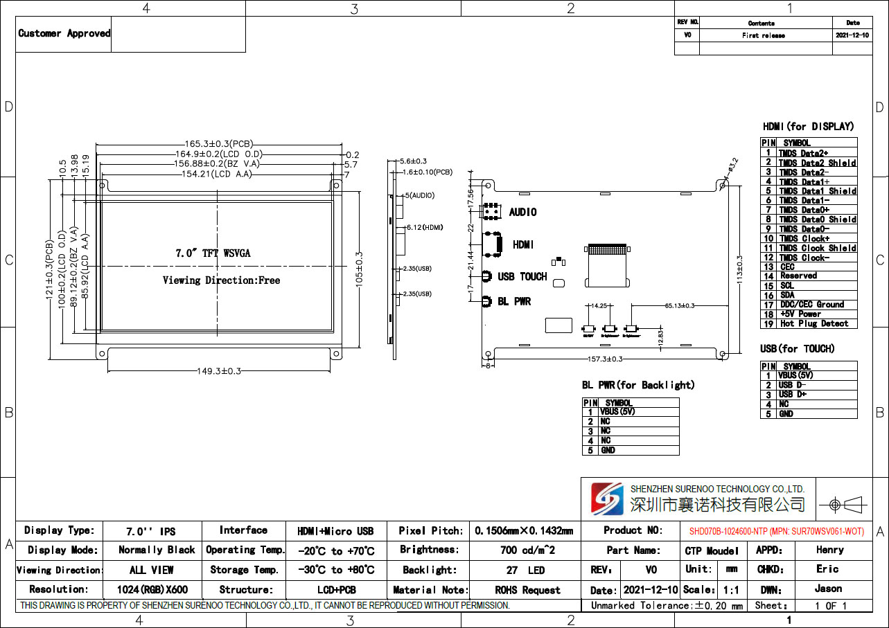 Item of General Information Contents Unit LCD Display Size (Diagonal) 7.0" Inch LCD Display Type TFT/TRANSMISSIVE - LCD Display Mode Normally Black - Recommended Viewing Direction IPS Full Viewing Angle O'Clock Model No. SHD070B-1024600-CTP/NTP - Resolutions 1024(RGB)*600 - Video Input Interface HDMI - Power Supply Micro USB 5.0V - Touch Type USB 5-Points Capacitive Touch Panel / Without Touch Panel - Backlight Type White LED (High Brightness) - Luminance(TYP) 800-900 CD/M2 LCM Module Size (W×H×T) 165.30×121.00 MM Active Area (W×H) 154.21×85.92 MM