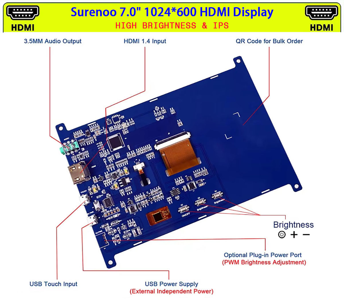 Surenoo HDMI Display 7.0" inch 1024*600 High Brightness 800 CD/M2 IPS LCD Display Module Screen Monitor with USB Capacitive Touch Panel CTP for Windows Win11 RaspBerry Pi 4B/5