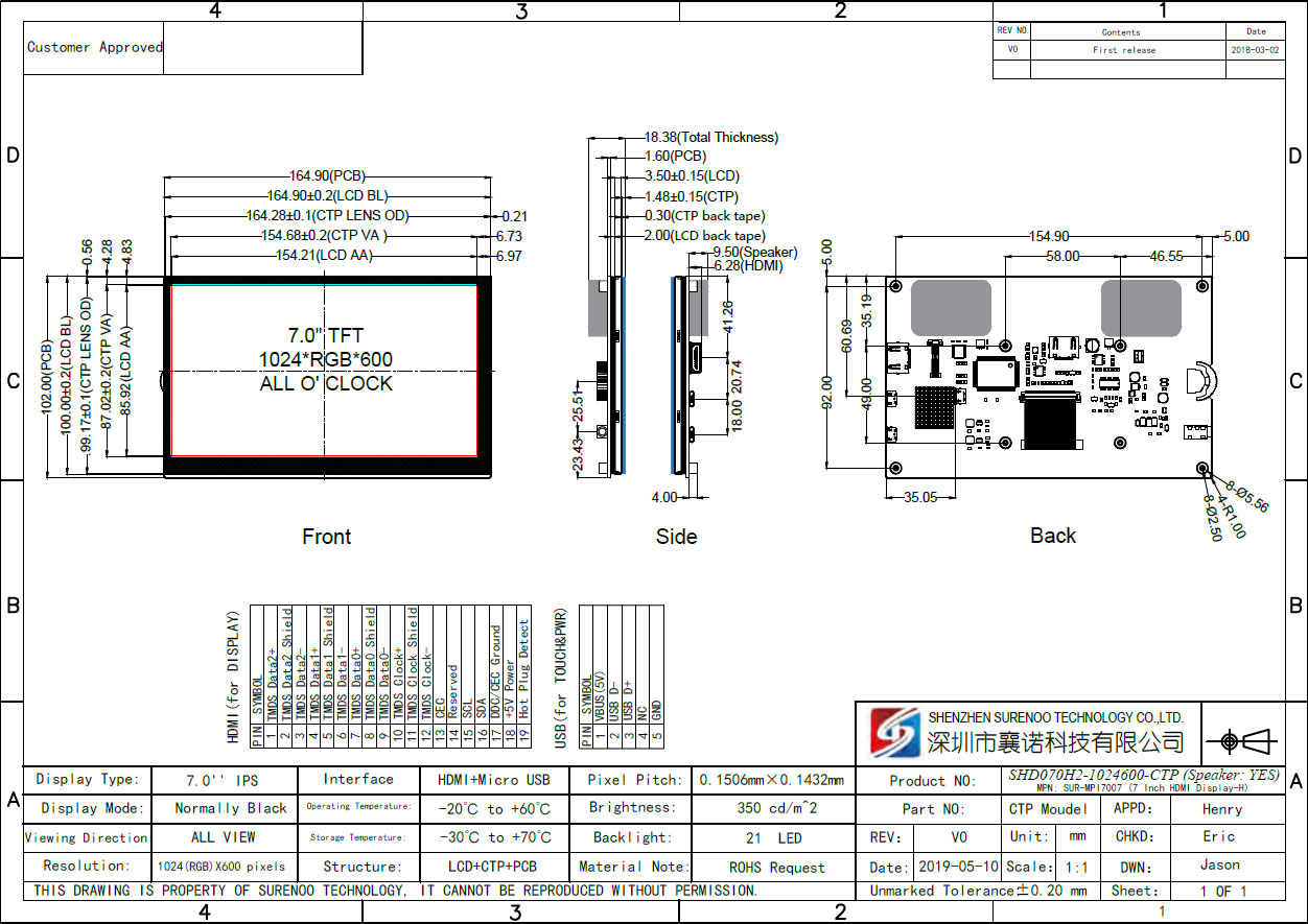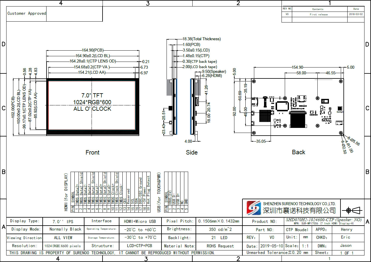 Model No. SHD070H-1024600-CTP (IPS) (Spearker: Yes/No) -