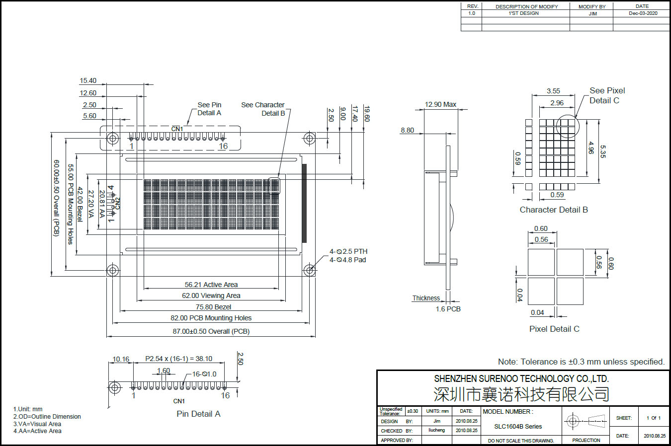 Gross Weight 0.072Kg Manufacturer Surenoo Display Type Character LCD Module / IIC Display ( Build-in IIC Controller) Continuity Supply More than 10 years Part No. SLC1604B Display Format 16x4 Character Interface 6800 4-bit Parallel, 6800 8-bit Parallel, Serial IIC IC or Equivalent AIP31066, ST7066 or Equal Fonts English-Japanese Voltage(Type) 5.0V in default, 3.3V is Optional Connection 1X16P/2.54 Pin Header Outline Dimension 87.00(W)x60.00(H)x12.90(T)mm Visual Area 62.00x27.20mm Active Area 56.21x20.81mm Display Type STN LCD-Yellow Green, STN Blue Negative Backlight Type (LED) Yellow Green, White IC Package COB Viewing Direction 6:00 O'Clock Operating Temperature-20℃~70℃Storage Temperature-30℃~80℃- Outline Drawing