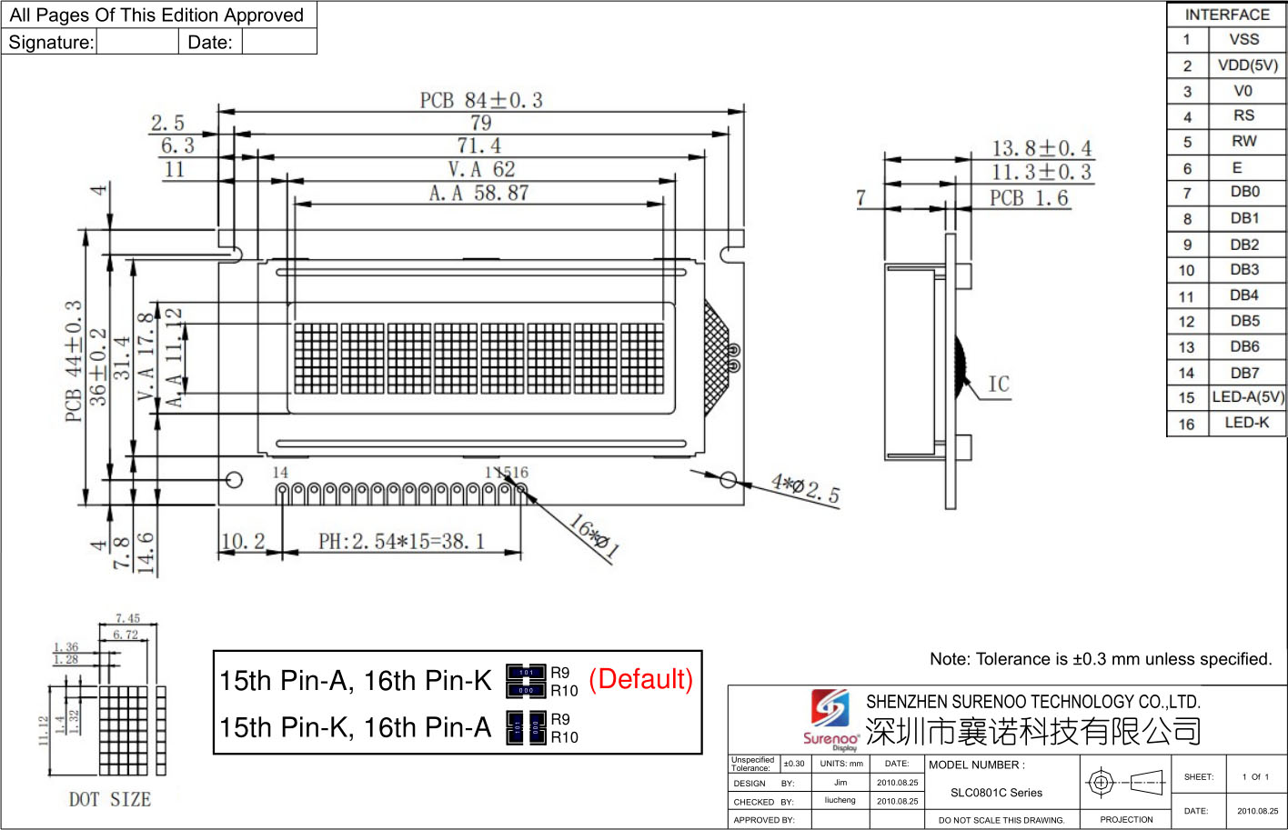 Gross Weight 0.040Kg Manufacturer Surenoo Diaplay Type Character LCD Module / IIC Display Continuity Supply More than 10 years Part No. SLC0801C Display Format 8x1 Characters Interface 6800 4-bit Parallel, 6800 8-bit Parallel, Serial IIC IC or Equivalent AIP31066, ST7066 or Equal Fonts English-Japanese, Other Fonts is Optional for Bulk Order. Voltage(Type) 5.0V in default, 3.3V is Optional Connection 1*16P/2.54 Pin Header Outline Dimension 84.00(W)x44.00(H)x13.80(T)mm Visual Area 62.00x17.80mm Active Area 58.87x11.12mm Display Type STN LCD-Yellow Green, STN Blue Negative, FSTN Positive Backlight Type (LED) Yellow Green, White IC Package COB Viewing Direction 6:00 O'Clock Operating Temperature-20℃~70℃Storage Temperature-30℃~80℃- Outline Drawing