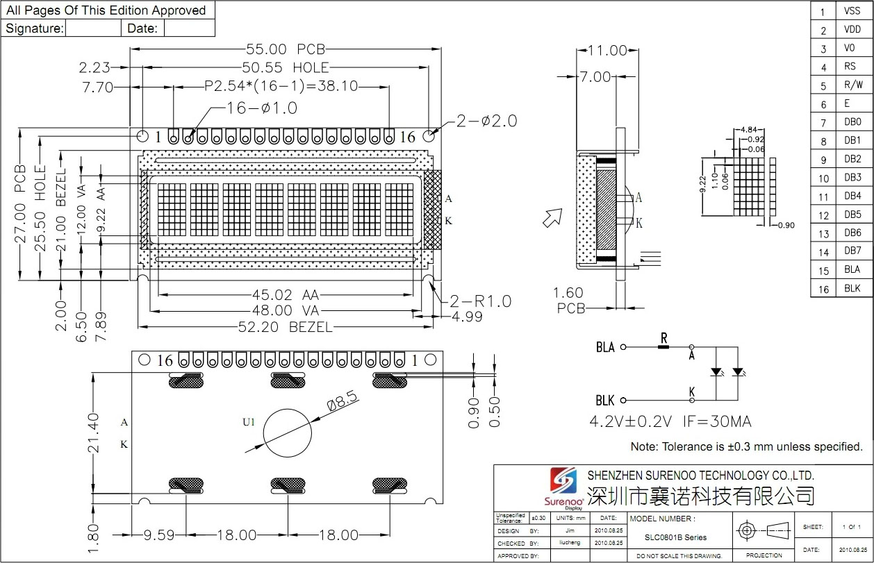 Gross Weight 0.020Kg Manufacturer Surenoo Display Type Character LCD Module Continuity Supply More than 10 years Part No. SLC0801B Display Format 8x1 Characters Interface 6800 4-bit Parallel, 6800 8-bit Parallel IC or Equivalent AIP31066, ST7066 or Equal Fonts English-Japanese, Other Fonts is Optional for Bulk Order. Voltage(Type) 5.0V in default Connection 1*16P/2.54 Pin Header Outline Dimension 55.00(W)x27.00(H)x11.00(T)mm Visual Area 48.00x12.00mm Active Area 45.02x9.22mm Display Type STN LCD-Yellow Green / STN Blue Negative Backlight Type (LED) Yellow Green / White LED IC Package COB Viewing Direction 6:00 O'Clock Operating Temperature-20℃~70℃Storage Temperature-30℃~80℃- Outline Drawing