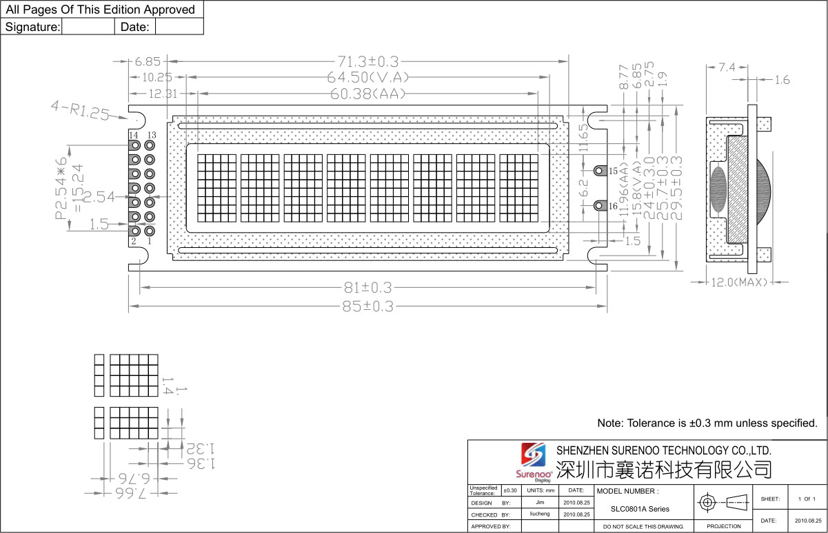 Gross Weight 0.040Kg Manufacturer Surenoo Diaplay Type Character LCD Module / IIC Display Continuity Supply More than 10 years Part No. SLC0801A Display Format 8x1 Characters Interface 6800 4-bit Parallel, 6800 8-bit Parallel, Serial IIC IC or Equivalent AIP31066, ST7066 or Equal Fonts English-Japanese, Other Fonts is Optional for Bulk Order. Voltage(Type) 5.0V in default, 3.3V is Optional Connection (2*7+2)P/2.54 Pin Header Outline Dimension 85.00(W)x29.50(H)x12.00(T)mm Visual Area 64.50x15.80mm Active Area 60.38x11.96mm Display Type STN LCD-Yellow Green, STN Blue Negative, STN Gray Backlight Type (LED) Yellow Green, White IC Package COB Viewing Direction 6:00 O'Clock Operating Temperature-20℃~70℃Storage Temperature-30℃~80℃- Outline Drawing