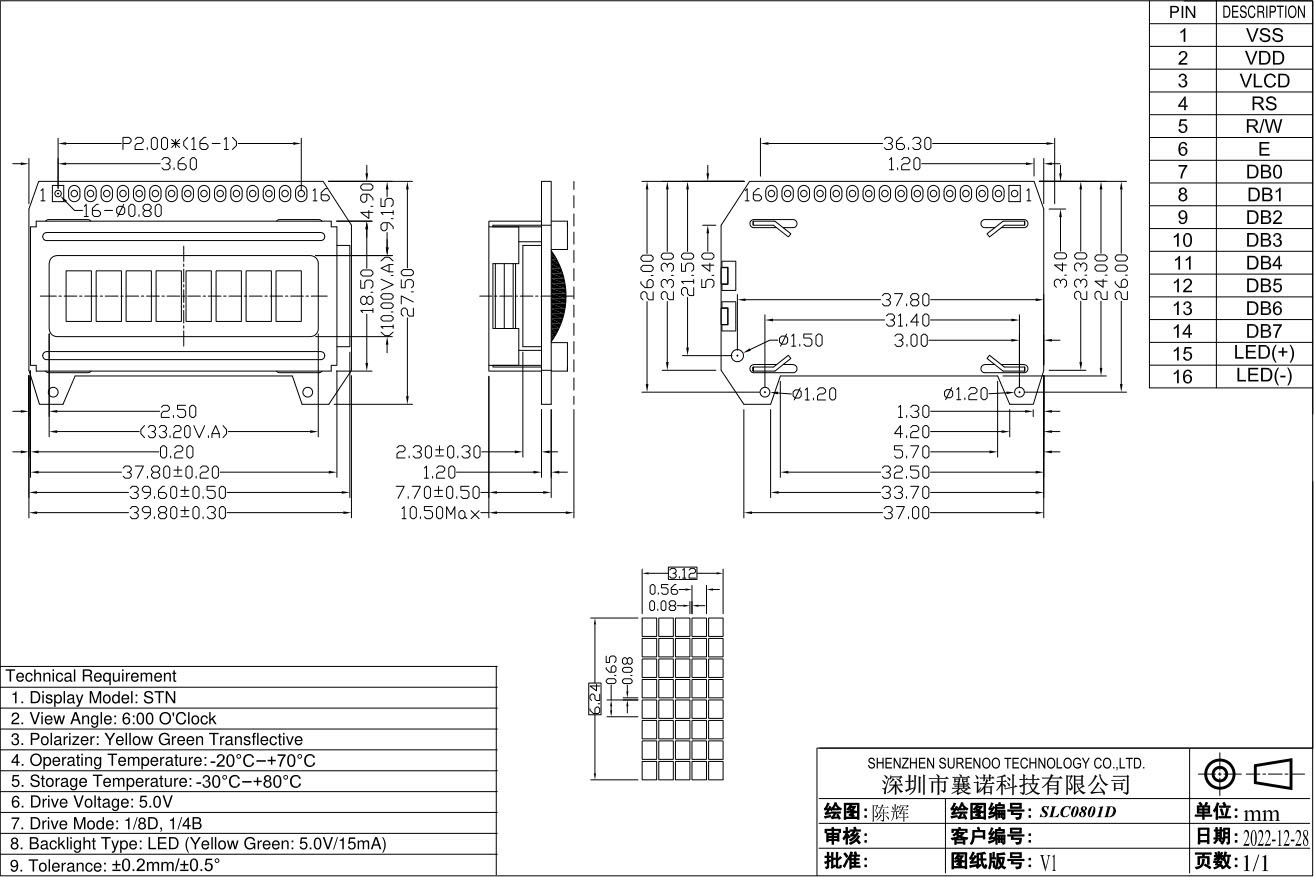 Gross Weight 0.020Kg Manufacturer Surenoo Display Type Character LCD Module Continuity Supply More than 10 years Part No. SLC0801D Display Format 8x1 Characters Interface 6800 4-bit Parallel, 6800 8-bit Parallel IC or Equivalent AIP31066, ST7066 or Equal Fonts English-Japanese, Other Fonts is Optional for Bulk Order. Voltage(Type) 5.0V in default Connection 1*16P/2.0 Pin Header Outline Dimension 39.80(W)x27.50(H)x10.50(T)mm Visual Area 33.20x10.00mm Active Area 29.44x6.24mm Display Type STN LCD-Yellow Green Backlight Type (LED) Yellow Green IC Package COB Viewing Direction 6:00 O'Clock Operating Temperature-20℃~70℃Storage Temperature-30℃~80℃- Outline Drawing