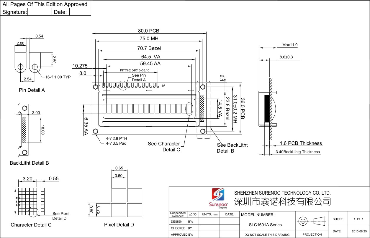 Gross Weight 0.040Kg Manufacturer Surenoo Display Type Character LCD Module / IIC Display Continuity Supply More than 10 years Part No. SLC1601A Display Format 16x1 Character Interface 6800 4-bit Parallel, 6800 8-bit Parallel, Serial IIC IC or Equivalent AIP31066, ST7066 or Equal Fonts English-Japanese Voltage(Type) 5.0V in default, 3.3V is Optional Connection 1X16P/2.54 Pin Header Outline Dimension 80.0(W)x36.0(H)x11.0(T)mm Visual Area 64.50x14.50mm Active Area 59.45x6.35mm Display Type STN Yellow Green, STN Blue Negative Backlight Type (LED) Yellow Green, White IC Package COB Viewing Direction 6:00 O'Clock Operating Temperature-20℃~70℃Storage Temperature-30℃~80℃- Outline Drawing