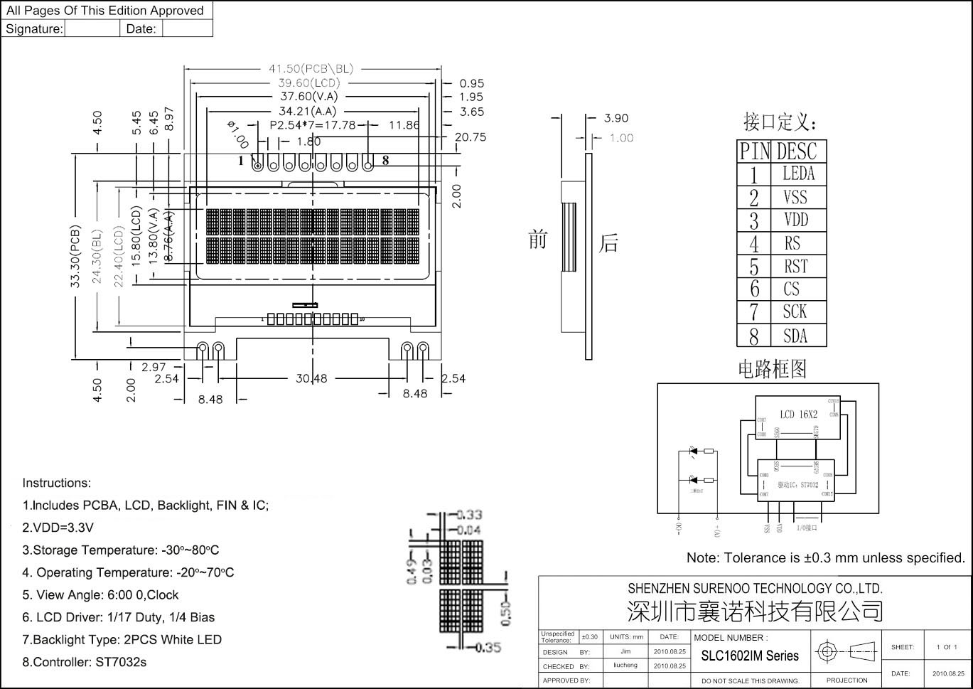 IM: 1X8P/2.54 Pin HeaderOutline Dimension IP: 41.50(W)x24.30(H)x3.90(T)mm IM: 41.50(W)x33.30(H)x4.90(T)mm Visual Area 37.60x13.80mm Active Area 34.21x8.76mm Display Type FSTN Positive Backlight Type (LED) White LED IC Package COG Viewing Direction 6:00 O'Clock Operating Temperature-20℃~70℃Storage Temperature-30℃~80℃- Outline Drawing
