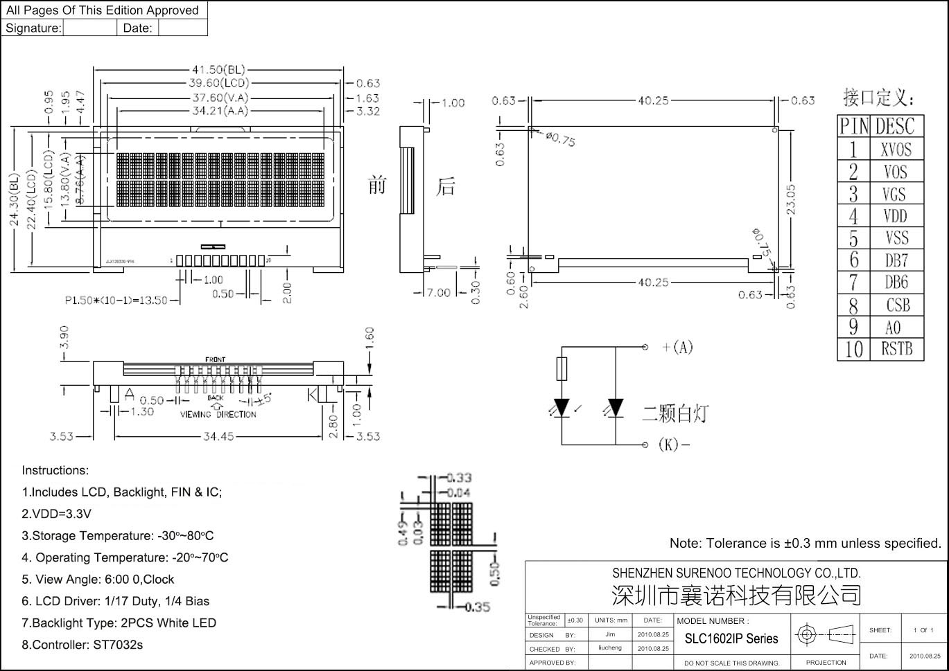 Pin No. Symbol Description Pin No. Symbol Description SLC1602IP (Without PCB Adapter) SLC1602IM (With PCB Adapter) 1 XV0S Bias Voltage (Insert 1uF Capacitor between them) 1 LEDA Power Suppy for Backlight (3.3V) 2 V0S 2 VSS Ground 0V 3 VGS Bias Voltage (Insert 1uF Capacitor between VGS and VDD) 3 VDD Logic Power Supply (3.3V) 4 VDD Logic Power Supply (3.3V) 4 A0(RS) Register Selection Singal (H: Data Register; O: Command Register) 5 VSS Ground 0V 5 RST Reset Pin 6 D7(SDA) Serial Data Signal 6 CSB Chip Selelction 7 D6(SCL) Serial Clcok Signal 7 SCK Serial Clock Signal 8 CSB Chip Selection 8 SDA Serial Data Signal 9 A0(RS) Register Selection Singal (H: Data Register; O: Command Register) 10 RST Reset Pin BLA & BLK: 3.3V